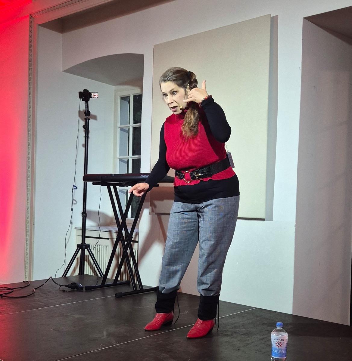 Mit einer Mischung aus Kunst, Comedy und einer unglaublich spannenden Lebensgeschichte führte die Bestseller-Autorin durch das abwechslungsreiche Programm und zeigte mit Gesangseinlagen gemeinsam mit dem Trio “Klangkunst”, was sie stimmlich noch drauf hat.