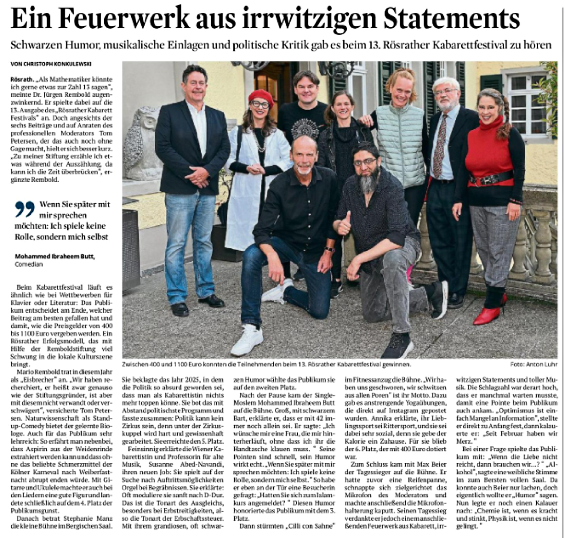 Bereits zum dreizehnten Mal unterhielten die Teilnehmer des beliebten Rösrather Kabarettfestivals mit wortgewaltigen und musikalischen Beiträgen das Publikum im restlos ausverkauften Bergischen Saal des Schloss Eulenbroich. Erneut präsentierten sieben Nachwuchskabarettistinnen und -kabarettisten ihre aktuellen Programme im Rahmen des vom Kulturverein mit Unterstützung der Dr. Jürgen Rembold Stiftung ausgerichteten Wettbewerbs und so entschied das bestens gelaunte Publikum nach den kabarettistischen Darbietungen und Comedy Stand-Ups auch in diesem Jahr, welcher Beitrag am besten gefallen hat.